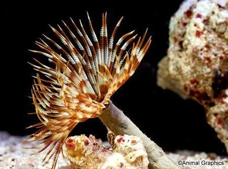 O espanador de penas, também conhecido como espanador de penas gigante, tem uma coroa em forma de leque (radiole) que é bronzeada ou laranja com colorações de faixa castanha. O rádio de algumas espécies de certos locais pode ter até 7 polegadas de diâmetro, ou de cores mais brilhantes.
